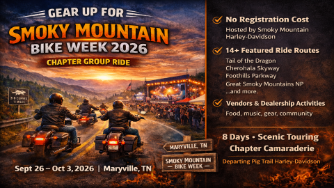 Initial Meeting for those planning to attend Smokey Mountain Rally - Time 4pm after Chapter Ride. This is the first of 2 pre-planning meetings. Next one 7/18/26.