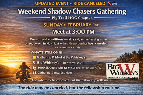 Come enjoy good food, great company, and some Pig Trail HOG fellowship. The ride may be canceled, but the fun and camaraderie roll on.
